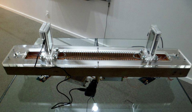 O dispositivo busca informações em tempo real, de modo a refletir as mudanças das marés e das fases da lua, de um lado, em contraponto ao fluxo de acesso à palavra "encontro" em diversos idiomas, do outro.