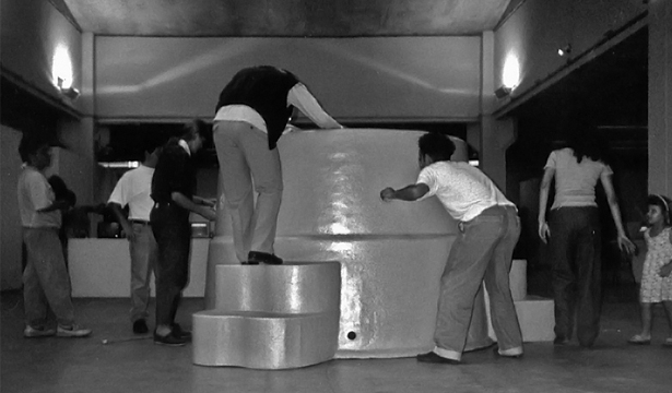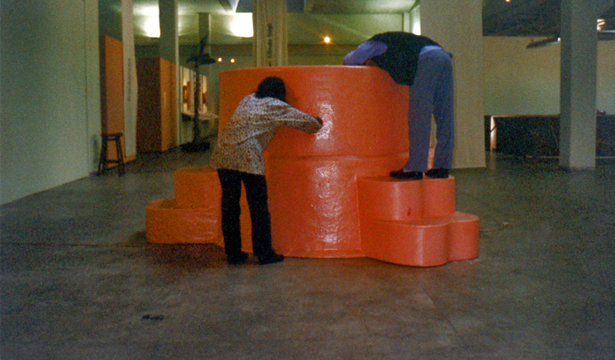 M.A. (desejo) é uma instalação interativa composta de uma peça cilíndrica de fibra de vidro de 2,70m de diâmetro por 1,70m de altura, ladeada por 3 escadas e 3 máscaras que dão acesso ao tampo superior aonde por mais 3 máscaras se pode olhar parcialmente o interior da caixa rosa: 1 câmera de vídeo colocada por trás do próprio espectador que se vê em posição de "voyeur", e pelos 2 orifícios das outras máscaras, 2 computadores com animações multimídias para serem navegadas.