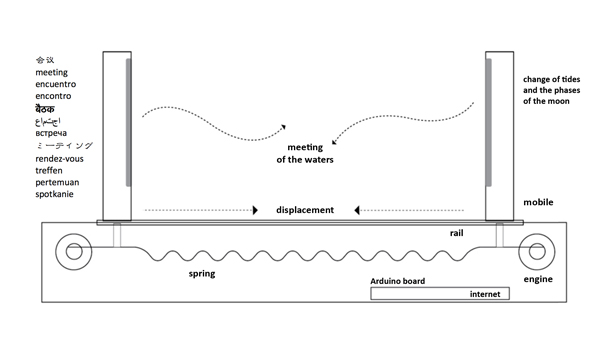 O dispositivo busca informações em tempo real, de modo a refletir as mudanças das marés e das fases da lua, de um lado, em contraponto ao fluxo de acesso à palavra "encontro" em diversos idiomas, do outro.